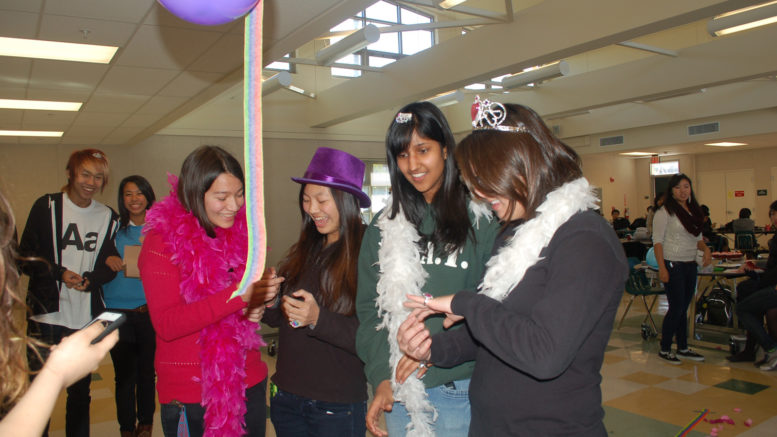 The A-wing cafeteria was decorated with balloons and rainbow ribbons for the mock wedding. The wedding aisle was created with ribbons, rose petals, and surrounded by colorful balloons. Students wore feather boas, tiaras, and rainbow ribbons to exchange vows. As couples walked down the aisle, the crowd threw rose petals and blew bubbles for them. Junior Hanna Naum-Stoian presided over the weddings, officiating marriages by reading poems. After the ceremony, students were given colorful rings, marriage certificates, and cupcakes to celebrate their marriage. Junior Zarrie-Samiezad Yazd, GSA’s president, said, “This year’s wedding was awesome! I’m really happy that we were able to give people the chance to celebrate Valentine’s Day in a unique way while spreading awareness of the issue of marriage equality at the same time. We had about 20 marriages in total. Going by what I observed, we had a pretty even balance of same-sex and opposite-sex marriages. One of my favorite parts of the event was that my good friend Junior Jocelyn Ha made these gorgeous Valentine-themed cupcakes that everyone loved. They made the event really feel like a true wedding!”