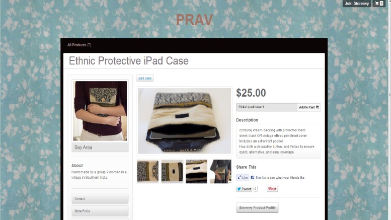 PF: Like I said, I looked online to buy my own iPad case and I was like, wait, I can’t find one where I can see where the benefits are going. So with that lack, I thought, okay, what if I design my own. I took a piece of paper, looked online, saw what was kind of cute, and used ethnic-ish materials to put it together, but I didn’t’ sew it myself. My mom and my sister actually went with me to India this past summer and we worked together with the women in the village, and we compiled the designs and figured out the patterns. First I designed the cases, and they have a copy of them there, and it’s nice because every time my family goes to India, they come back with like 30 cases, so I don’t have to pay as much for shipping. So that’s how the shipping part works out. Setting up the storenvy was pretty straightforward; it’s a bit like setting up a blog. As I recently bought a domain name, I’m planning on making an html site.