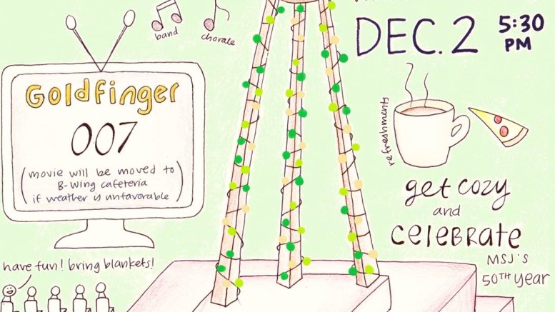 What’s better than sitting at home and studying? Almost everything, really, but especially watching a movie with your friends while savoring holiday treats and cozying up in your blanket under the twinkling lights of the bell tower! Join us at 5:30 PM on Tuesday, December 2 to celebrate MSJ’s 50th Anniversary with the lighting of the bell tower and the classic James Bond movie, Goldfinger. As a bonus, enjoy renditions of your favorite holiday tunes, courtesy of MSJ Choir and Band. Bring your chair, cheer, and cherished ones!