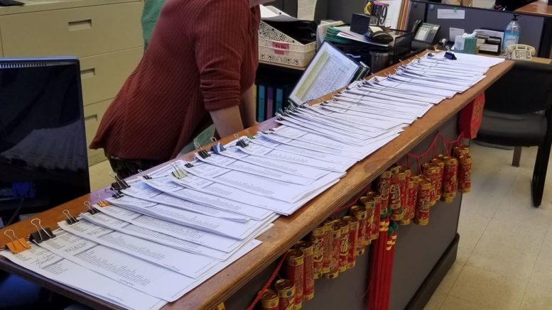 Depicted: Attendance sheets pile up in the office due to teacher absences.