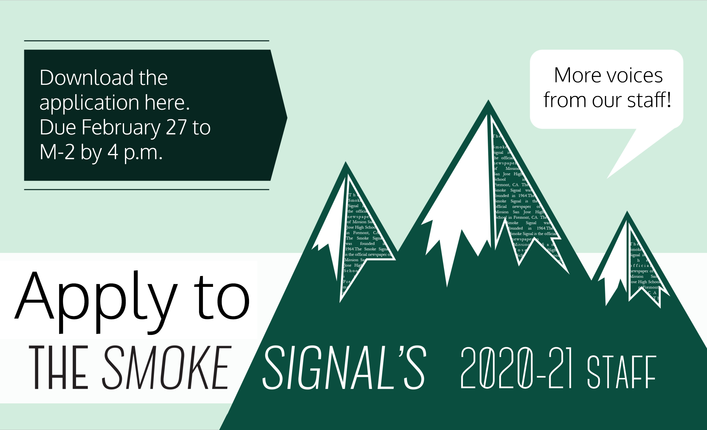 Apply to Journalism* and the Smoke Signal’s 2020-21 Staff! If you have any questions about the class, please visit our FAQ page.