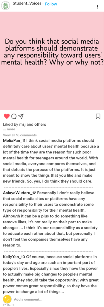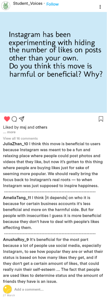 Note: The Instagram post and accounts are not real. The accounts are not meant to represent real accounts of respective students, and the usernames are in the format of FirstLastName_Grade.