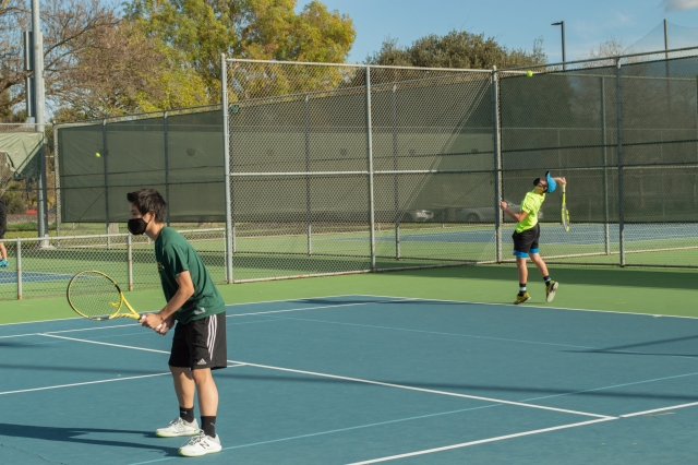 Boys Tennis competed against the Newark Memorial High School Cougars in their first game of the season on March 11 at Fremont Tennis Center. With little notice into the start of the season and only one week of practices to adjust to new social distancing guidelines, the MSJ Warriors triumphed 6-1 against the Cougars.