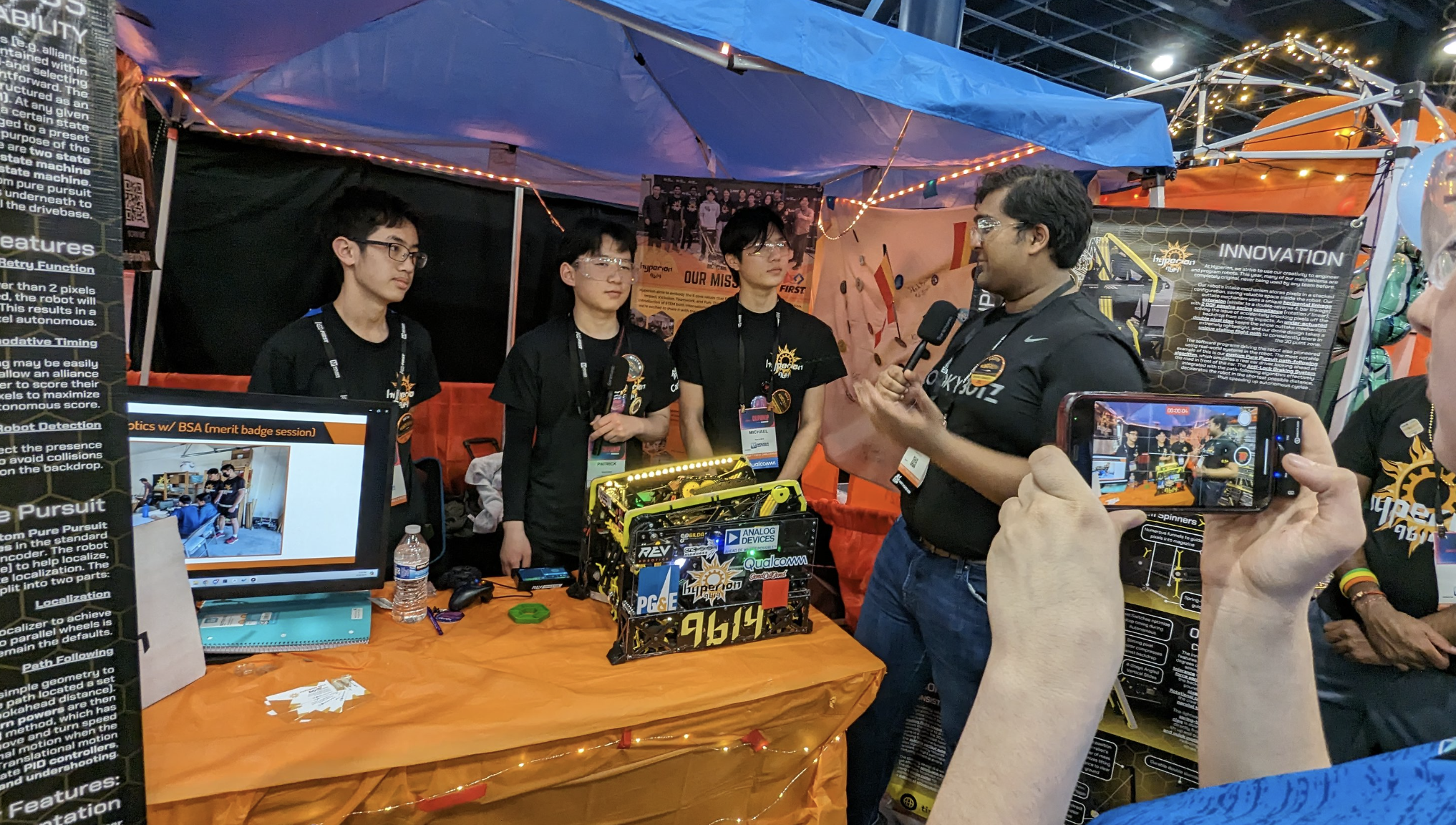 The following day, Hyperion had five more consecutive victorious qualification matches and four more qualification matches on Friday, culminating to a 7-3 win-loss ratio, placing them 11th in the division. Due to Hyperion’s stellar performance, the team was selected as the first pick alliance partner by 16468 Green Lemons. On Thursday, the team was also interviewed by FIRST Updates Now, a competitive robotics YouTube channel, to be featured in a Behind the Bot video.